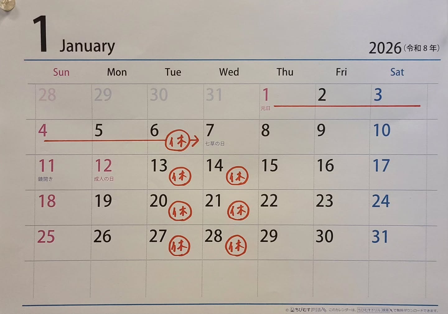 1月のお休みです。